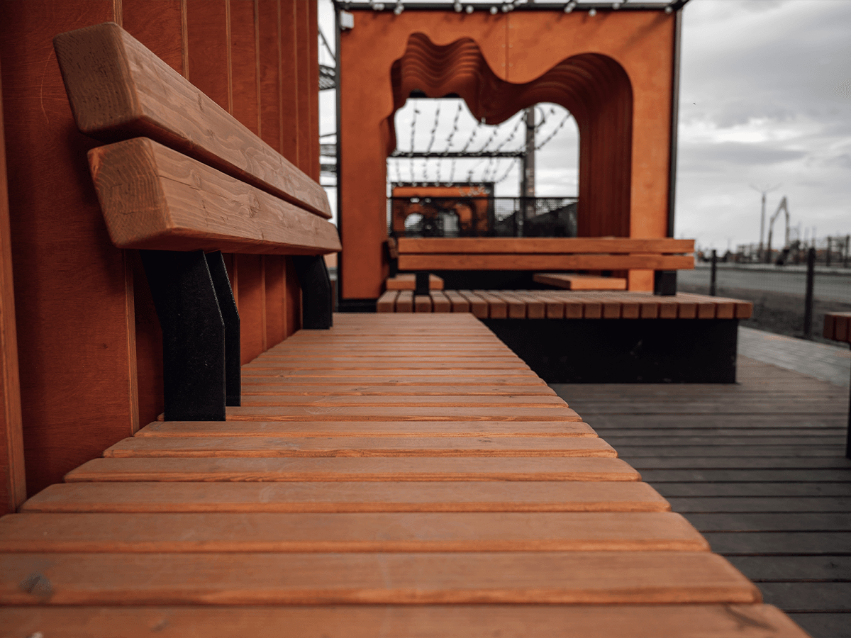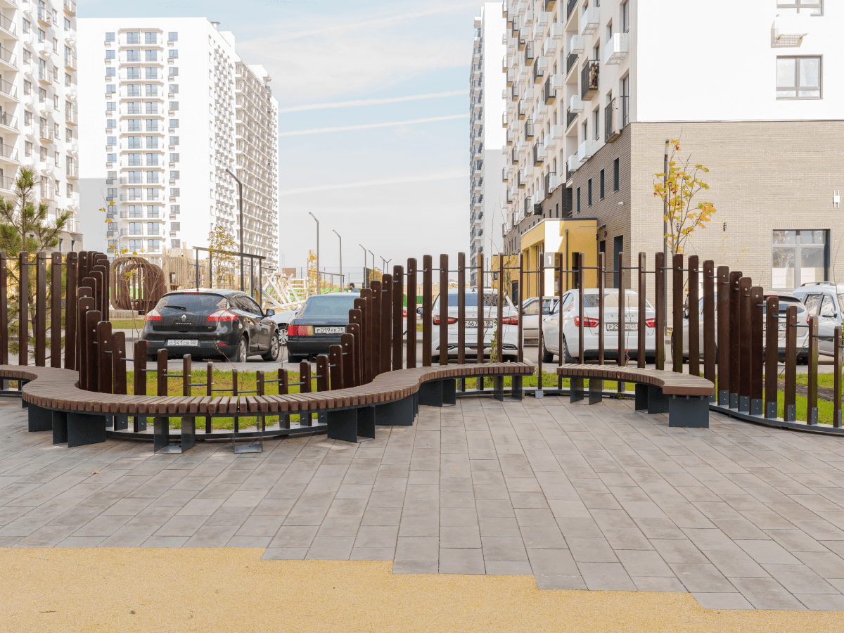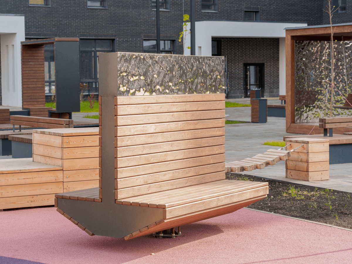 Мы выполнили обе задачи и оформили уникальную придомовую локацию в городе Пенза. Для времяпрепровождения горожан — беседки как с качелями, так и более уединенные популярные Ламели, большое количество скамей разных конфигураций и навесы для защиты от солнца. Для создания притягательного внешнего облика — единый цвет дерева конструкций, впечатляющие формы изделий и элементы с эффектом водной глади на скамьях и беседках.