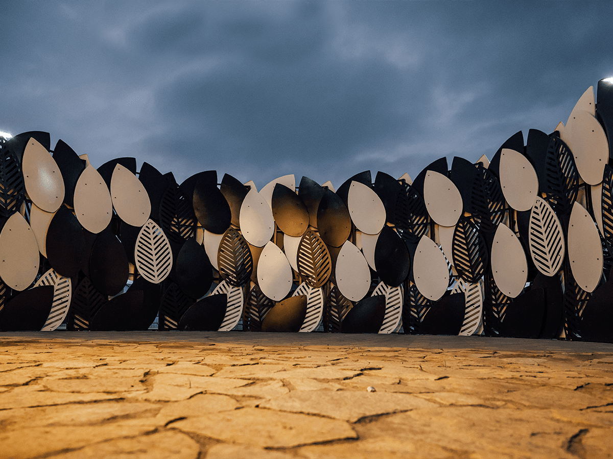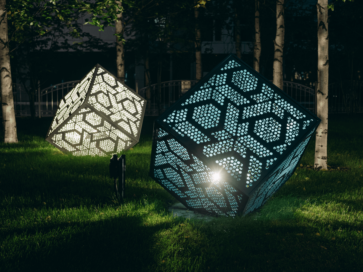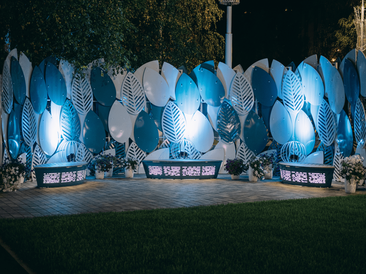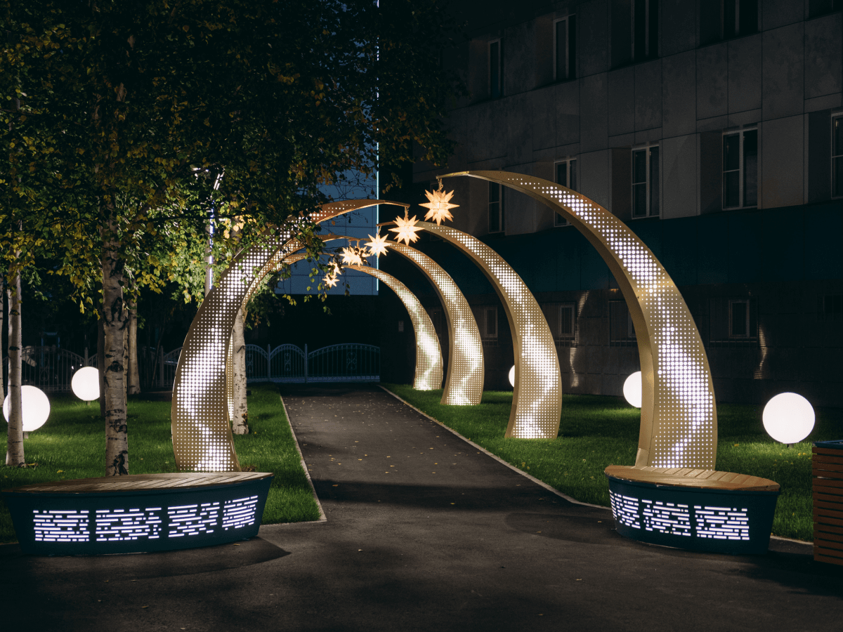Поэтому для проекта мы использовали декоративные и функциональные конструкции: навес и скамьи с украшением в виде листьев, фонари, светящиеся кубы и шары, а также скамьи, цветочницы и урны, выполненные в едином стиле. «Изюминкой» этой локации является аллея из навесов-полуарок со звездами.