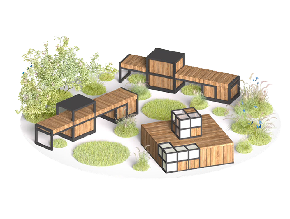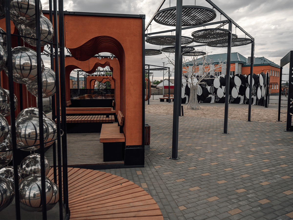 Разработали комплексный проект для города Купино в Новосибирской области. На небольшой территории мы эргономично разместили два парклета, беседки, навесы, модульные системы, скамейки и другие функциональные МАФы.