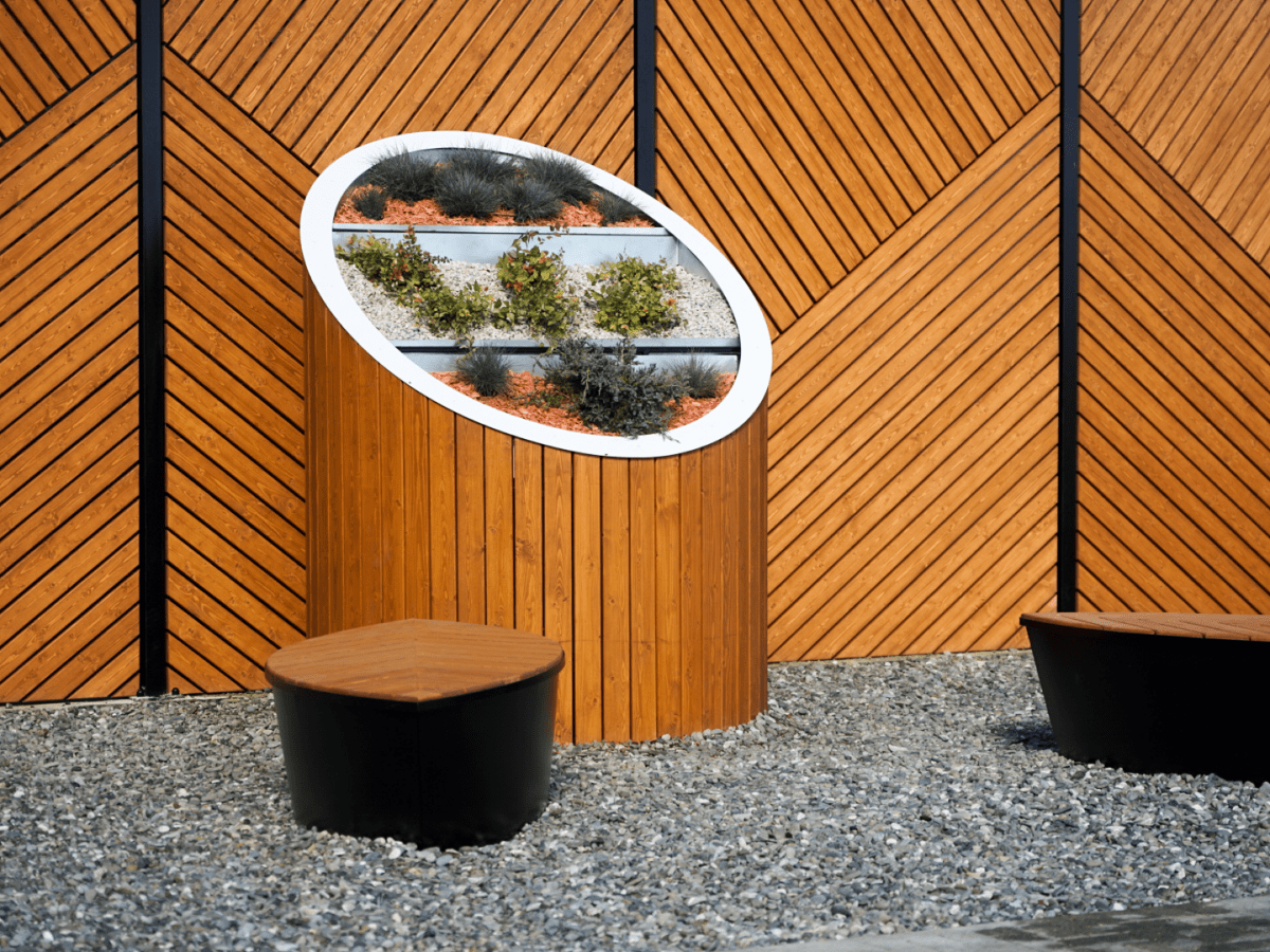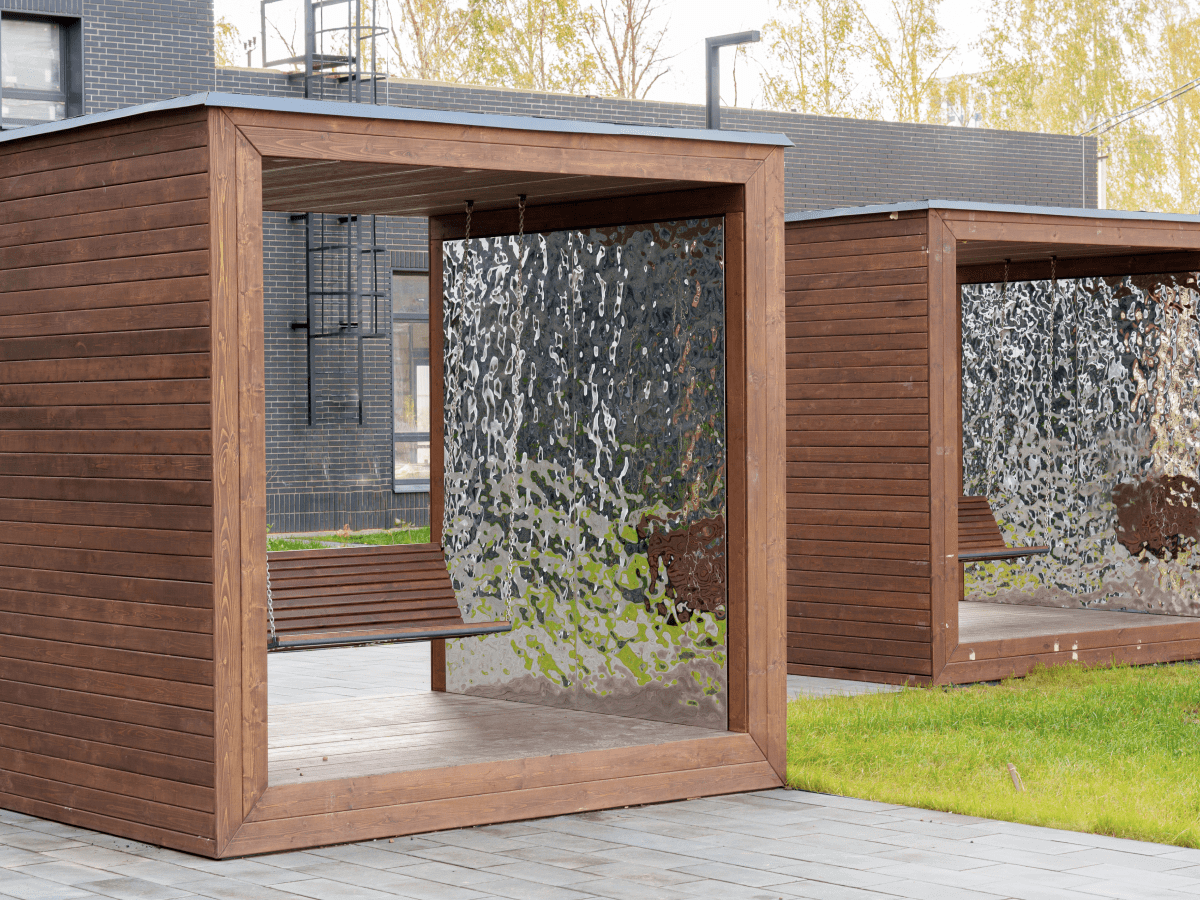 Для технолицея им. В. И. Долгих мы благоустроили территорию тремя беседками Cube, завораживающие внутренним отделочным материалом с эффектом водной глади. Также в этом проекте мы разместили три навеса с качелями, на которых часто располагаются студенты после занятий.